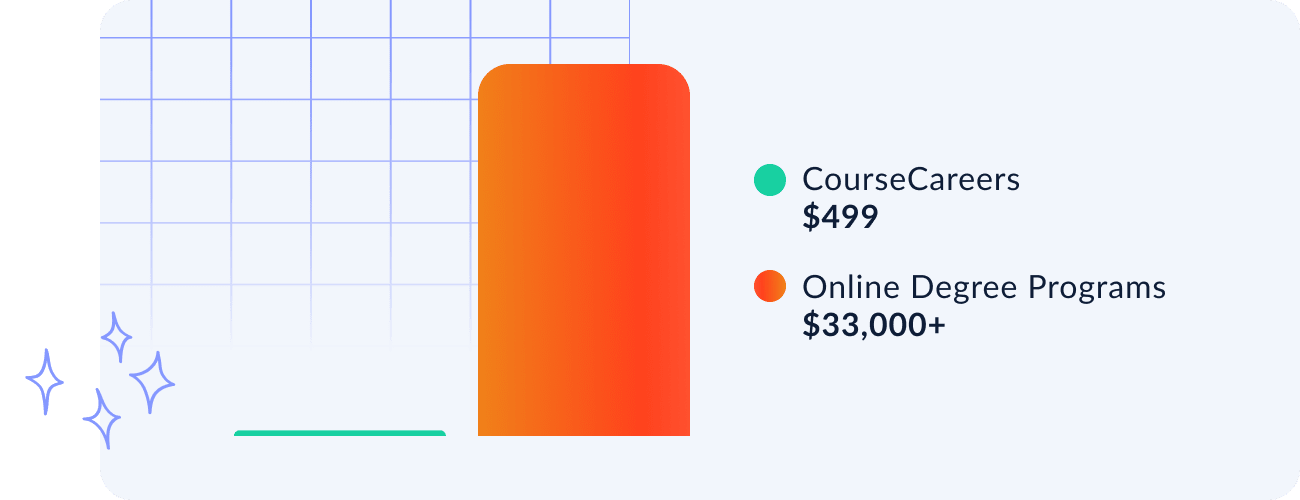 Time: Traditional online degrees require 2.5–4 years of coursework before you’re even ready to apply for roles. CourseCareers programs take just 1–6 months, meaning you can enter the workforce 5–8× faster and start gaining real experience instead of waiting years to graduate.